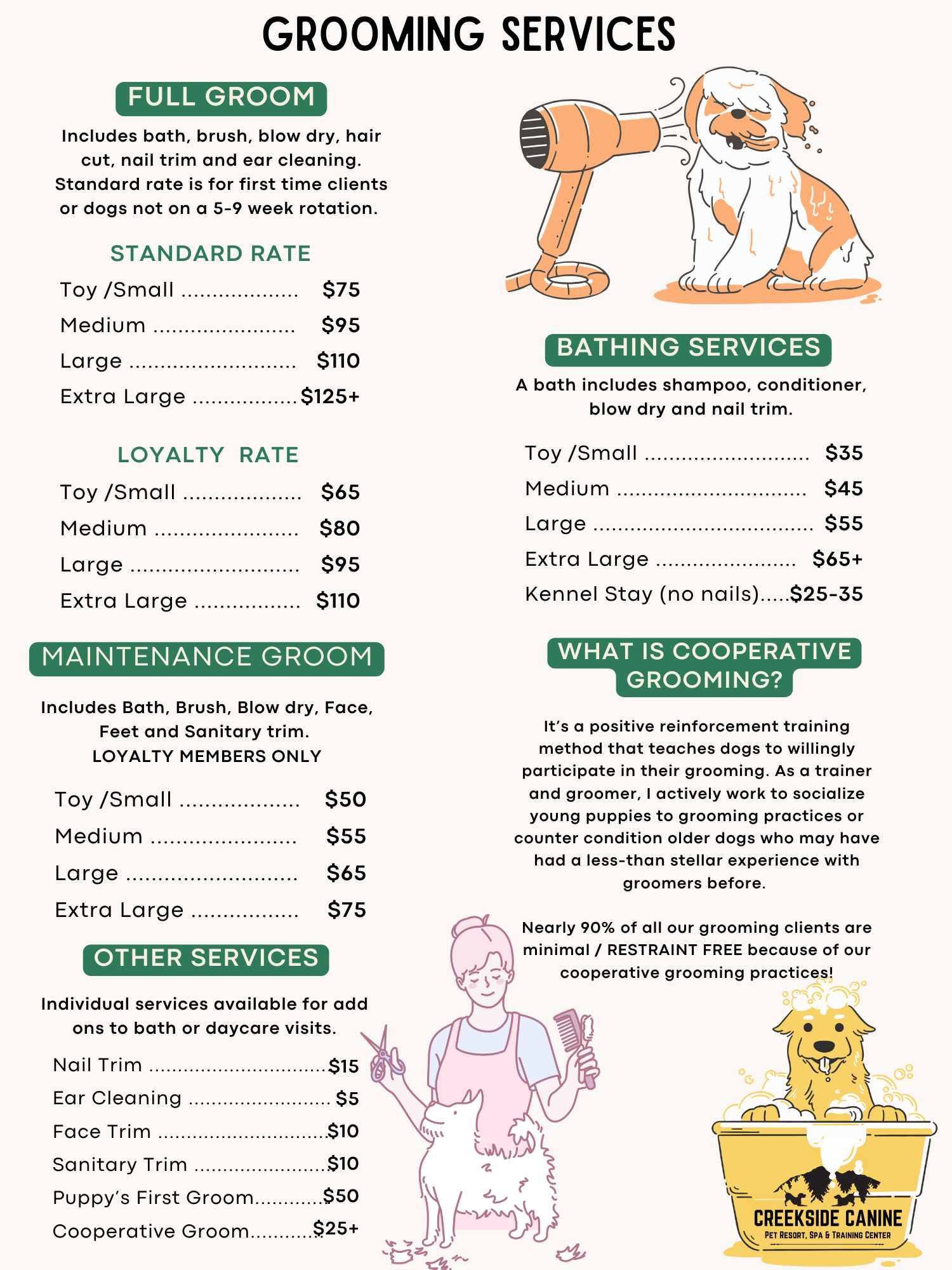 Creekside Canine specailizes in one on one and small group scheduling, allowing each dog the time and space to settle in, take breaks and be groomed at a pace that supposrts both their comfort and their final result. We are happy to offer grooming services to well behaved dogs of all shapes and sizes.